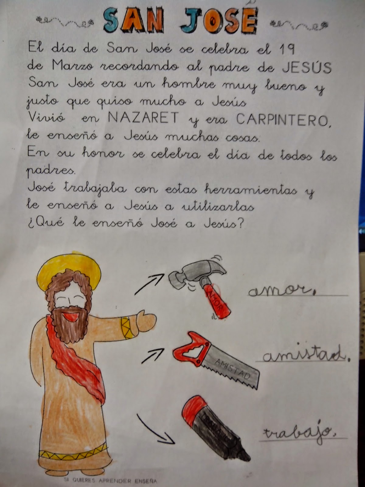 Los alumnos/as de 1º de Primaria, han recordado que el papá del niño Jesús, era José el carpintero y que las herramientas que utilizaba con él eran: AMOR, AMISTAD Y TRABAJO.